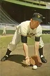 However, 1954 was his last full season as a player. On April 23, 1955, Williams severely injured his back in an on-field collision with Jackie Robinson of the Brooklyn Dodgers — the result of a brushback battle between the two bitter rivals. The Giants' pitcher, Sal "The Barber" Maglie, was notorious for knocking batters down at the plate. Maglie had angered the Dodgers by throwing several pitches high and inside on Brooklyn hitters, including a pitch that sailed behind Robinson's head. In the fourth inning, Robinson dropped down a bunt, intending to retaliate for the knockdown pitch by crashing into Maglie as he fielded the ball. But Maglie did not come off the pitching mound and Robinson instead collided with Williams, who was covering first base.[2] Robinson later said that his intended target on the play had been Maglie. Williams was able to finish the game and appear in 82 games for the 1955 Giants. But he reinjured his back in midseason and persistent back pain forced his retirement as a player at the age of 27. Teammate Alvin Dark recalled that Williams was never the same after the collision.[3]