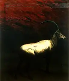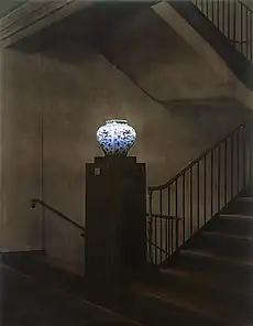 In 1985, Klamen began creating meticulous oil renderings of solitary, frozen animals (based on natural museum tableaux) and atmospheric, noir-ish landscapes based on memory,[40] which he explored for their metaphorical qualities.[13][14][21] He nearly obliterated these images with a layer of up to twenty coats of varnish,[41] distancing them under an impenetrable, dark sepia-toned gloss, like insects in amber.[42][43] This slowed disclosure of the work, as viewers had to allow their eyes to adjust to the hard-to-decipher images.[44] He complicated the work by overlaying symbols, shapes or lines (often in stark white) on the varnished surface or by inexplicably leaving key areas unvarnished—and thus surreally illuminated—creating what critic Donald Kuspit called an "ominous, unresolved, uncanny contrast."[15][12][19] In the early 1990s, Klamen introduced similarly haunting, austere images of architectural interiors—Victorian lobbies, halls and staircases in museums and universities,[45] often featuring solitary, illuminated precious objects—with works such as in Untitled (1993, see left) that some critics felt were his most powerful to date.[46][22][47]