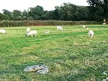 Passmore noted that in a field to the southwest of the farmhouse stood three large sarsen boulders.[28] One, which was lying on its side, measured at least 0.91 metres (3 ft) and 2.1 metres (7 ft) long. The other two were smaller.[29] Passmore related that an old man had recollected seeing other stones in this field being broken up many decades previously. The old man thought that there had once been a full circle of stones in the field, although Passmore considered this testimony "not sufficiently strong to build upon".[29] Passmore also related finding flint tools and crude pieces of pottery in the field near these sarsens.[29]