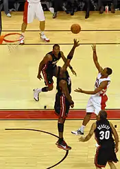 The Raptors finished the regular season as the second seed in the Eastern Conference with a 56–26 record. In the first round of the playoffs, the Raptors faced the seventh-seeded Indiana Pacers, and in a Game 5 win on April 26, DeRozan scored 34 points to help the Raptors take a 3–2 series lead.[33] In Game 7 of the series, DeRozan scored 30 points to help the Raptors win a best-of-seven series for the first time in franchise history. With a 4–3 series victory over the Pacers, the Raptors moved on to the second round to face the Miami Heat.[34] In Game 5 of the Raptors' series with the Heat, DeRozan again scored 34 points to help the Raptors take a 3–2 series lead with a 99–91 win.[35] In Game 7 of the series, he scored 28 points in a 116–89 win over the Heat, helping the Raptors advance to the conference finals for the first time in franchise history.[36] In Game 4 of the Eastern Conference Finals against the Cleveland Cavaliers, DeRozan scored 32 points to help the Raptors win 105–99 and tie the series at 2–2.[37] The Raptors went on to lose the next two games to bow out of the playoffs with a 4–2 defeat.