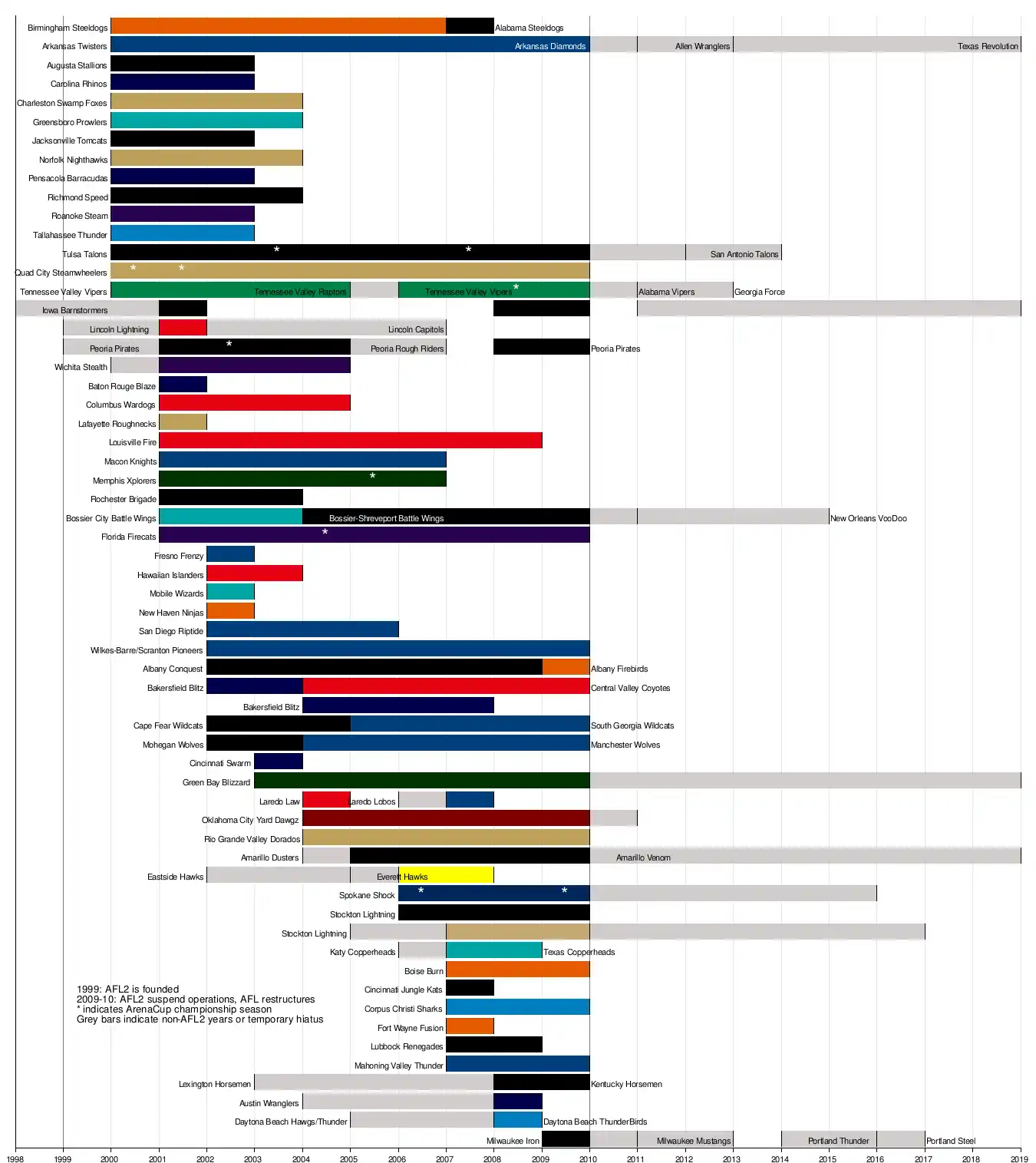 The following is a list of teams that, at one time, played in the AF2. This does not include teams in AF2 when the Board of Directors formed the New AFL in 2010.