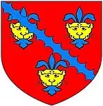 Denys: 3 leopards' faces jessant-de-lys, over all a bend engrailled. With tinctures it becomes:Gules, 3 leopards' faces or jessant-de-lys azure, over all a bend engrailled of the last. The Denys arms blazoned with these tinctures survive earliest in BL Add. MS 45131, f. 54, a 1509 drawing of Hugh Denys of Osterley (d. 1511) at the deathbed of Henry VII. The armourials are the arms of Cantilupe of Candleston Castle, Glamorgan, probably granted as "arms of patronage" to their feudal officials or tenants the Denys's, differenced by the imposition of a bend engrailled, probably before 1258. Cantilupe arms, reversed for difference, are still borne as the official arms of the See of Hereford, in honour of St. Thomas de Cantilupe, Bishop of Hereford, canonised in 1320. The Denys arms are a rare ancient exception to the rule "no colour on colour or metal on metal" propounded by John Gibbon in his 1682 Introductio ad Latinam Blasoniam, in which he lists (pp. 150–1) some exceptions, including Denys: "Now for my reader's diversion and delight I will insert what hath fallen under my observation". The Denys arms are also shown sculpted on the wings of the nearby Tudor mansion Siston Court, built by Sir Maurice Denys (d. 1563), great-grandson of Maurice Denys (d. 1466), yet there they have been altered to a neater composition, with the bend passing between the leopards' faces, and the latter composition was also adopted by the Denys family of Pucklechurch, lords of that manor until 1701.