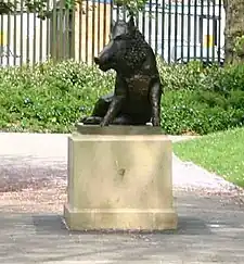 Over the years the Arboretum has incorporated a variety of buildings, statues and ornaments. Perhaps the best known locally is the Florentine Boar statue, which was originally placed on the site in 1806, when the land was Joseph Strutt's private garden. Strutt had commissioned William John Coffee, a Crown Derby sculptor, to make an earthenware copy of the bronze statue which he had seen when he once visited the Mercato Nuovo (New Market) in central Florence. The earthenware boar remained in place after the creation of the Arboretum until it was damaged (actually decapitated) during a German air raid on Derby on 15 January 1941.[4][5][6] However, a claim was reported in January 2002 that a Derby resident had, as a child, accidentally broken off the boar's head while climbing on the statue.[5] The current statue is a bronze replacement dedicated in 2005.[7]