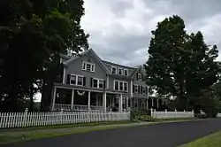 The oldest portion of the house, its leftmost section, was built in about 1876 as a 1+1⁄2-story Cape style house, by A.G. Dewey, owner of Dewey's Mills. The house affords a commanding view of both the nearby Ottauquechee River and the mill pond associated with his mills, which are no longer standing, demolished in the 20th century by the United States Army Corps of Engineers as part of the Hartland Dam project. A single-story ell, extending to its right, was also built at that time, and the house was enlarged by subsequent generations of Deweys to reach its present configuration. At the time of the house's listing on the National Register in 1999, it still belonged to Dewey's descendants.[2]