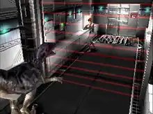 Dino Crisis features survival horror gameplay that is very similar to Capcom's early Resident Evil titles.[4] Regina can walk, run, turn, backpedal, push and climb objects, and perform a 180-degree turn.[5] A map is available which will show Regina's location, destination, save points, and locked doors.[5] Save points are rooms which will prompt the player to save upon exiting them.[5] Some doors are locked by a D.D.K. (digital disk key) device. To open these doors, the player will need both a code disc and input disc which can then be used to decipher a code and unlock the door.[5] There are also force fields of red beams throughout the complex which can be activated to block access to intruders.[5]