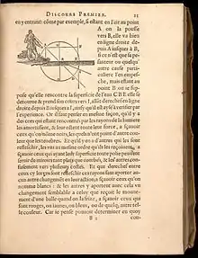 "La dioptrique" (in English "Dioptrique", "Optics", or "Dioptrics"), is a short treatise published in 1637 included in one of the Essays written with Discourse on the Method by René Descartes. In this essay Descartes uses various models to understand the properties of light. This essay is known as Descartes' greatest contribution to optics, as it is the first publication of the Law of Refraction.[1]