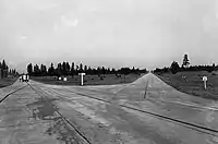 Much of Division Street north of the Spokane River began as an unpaved road. It was not until 1929 that Division saw its first pavement moving north from Downtown Spokane when pavement was laid up to Garland Avenue. In 1930, it the pavement was extended to Wellesley Avenue. It wasn't for another two years in 1932, that pavement got extended further north again. The Division Street "Y" was carried cars on pavement for the first time on September 28 of that year.[8]