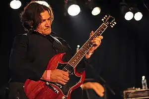 Dom Mariani & the Majestic Kelp were formed as an instrumental group in 2003. Mariani reunited with former Go-Starts drummer Robbie Scorer, and new associates Killian Albrecht on guitar and Stu Loasby on bass guitar. Price described their sound as "cool surf guitar/postmodern lounge instrumental".[15] They released their debut album, Underwater Casino in July. In 2005 Mariani was inducted into the WAMIA Hall of Fame.[6] In August that year he curated a 2× CD compilation album, Popsided Guitar: Anthology 1984–2004, which featured material from The Stems, The Someloves, DM3, The Stoneage Hearts and The Majestic Kelp.[7][34] The cover depicts Mariani holding his Rickenbacker 330 Fireglo six-string guitar, which he used for The Stems and DM3.[35] Mariani put together a new line-up to promote the retrospective under the banner of Dom Mariani & The Rippled Souls. Featuring Kelp cohort Stu Loasby on bass, Kevin Borruso on guitar and Shaun Sibbes on drums. The newly christened 4 piece toured throughout Europe and Japan in early 2006 as well as a successful eastern states tour. The Rippled Souls also opened for John Fogerty and Teenage Fanclub. Following on from the tour, The Majestic Kelp's second album, Music to Chase Cars By, was recorded in Perth and mixed in San Diego by Mark Neill (The Black Keys, The Palominos, Old 97's) at Soil of the South Studios and issued in 2006. The group's line-up was expanded with the addition of two new members, Toby Gosfield on keyboards and Billy Rogers on saxophone.