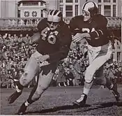 Born in 1928 in St. Louis, Mo., the son of Lyda and Russell Peterson. In his youth, his family moved to Racine, WI. He attended St. Catherine's High School and played football for the undefeated Angel's championship football team in 1945.[1] After graduating, Don enlisted in the U. S. Army and served in Japan, where he organized sports activities for U. S. troops after World War II. After returning, he accepted a scholarship to play football for the University of Michigan, and played football for the Michigan Wolverines football team from 1948 to 1951.[3][4][5][6] He played in the 1951 Rose Bowl game and finished the 1951 season as the fourth leading ground gamer in the Big Ten Conference.[7] During the 1951 season, he scored two touchdowns against Iowa and rushed for a career-high 104 yards against Illinois. In his final game for Michigan, Peterson rushed for 70 yards and scored the only touchdown in a 7–0 win over Ohio State.[8] At the end of the 1951 season, he was selected as the Most Valuable Player on the 1951 Michigan Wolverines football team and selected to play in the 1951 Blue/Grey All-Star Classic .[7] After graduating with honors with a major in zoology, he went on to graduate from the University of Michigan, School of Dentistry. His older brother, Tom Peterson, played fullback for Michigan in 1944–1949.[7][9] Don was selected by the Green Bay Packers in the 17th round (196th overall pick) of the 1952 NFL Draft.[10]