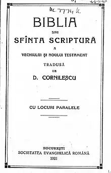 Cornilescu was born in Slașoma, Mehedinți County, the son of a teacher. Both his grandfathers were Orthodox priests. He studied at the Central Seminary from 1904, quickly becoming noted for his scholarly diligence.[1] He felt that existing Romanian versions of the Bible, notably the Bucharest Bible of 1688, were written in an archaic form of the language and that a modern version was badly needed. In 1913 he became a Romanian language tutor to Rev. John Howard Adeney who was the Anglican priest in Bucharest, and also agent for the British and Foreign Bible Society (BFBS), and in this way Cornilescu started a relationship with the Bible Society. In 1914 Cornilescu became a monk so that he could concentrate on translating. His work was supported financially by the Princess Ralu Callimachi, a Moldavian noblewoman, who was also a supporter of the Bible Society. His version of the Psalms appeared in 1920, followed by the New Testament in 1921, and, later in the same year, the full Bible.[2] The printing was paid for through Bible Society friends in Switzerland and England.