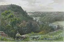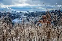 East Rock of south-central Connecticut, United States, with a high point of 366 feet (112 m), is a 1.4-mile (2 km) long trap rock ridge located primarily in the neighborhood of East Rock on the north side of the city of New Haven. A prominent landscape feature and a popular outdoor recreation area with cliffs that rise 300 feet (91 m) over the city below, East Rock is part of the narrow, linear Metacomet Ridge that extends from Long Island Sound near New Haven, north through the Connecticut River Valley of Massachusetts to the Vermont border.[1][2] East Rock is the central feature of East Rock Park, a municipal park owned by the city of New Haven along the New Haven-Hamden town line.