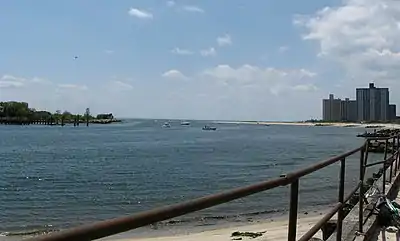 The East Rockaway Inlet is an arm of the Atlantic Ocean which separates the Rockaway Peninsula from the barrier island which includes the Nassau County, New York communities of Atlantic Beach, Long Beach and Lido Beach. The inlet is on the south shore of Long Island. It provides for a channel 12 feet deep and 250 feet wide. A 3,000 foot jetty on the western side of the channel was authorized but never constructed, and was eventually deauthorized by Congress in 1977.[1]