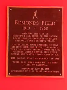 Edmonds Field was home to the Sacramento Solons, the Pacific Coast League AAA team from 1910 through 1960, after which they moved to Hawaii. The field was located at the southeast corner of Broadway (originally Y Street) to the north (third base); Riverside Boulevard (originally 11th Street) to the west (first base); and First Avenue to the south (right field).