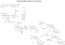 The biosynthesis of cephaeline and emetine come from two main biosynthesis pathways: the biosynthesis of dopamine from L-tyrosine and the biosynthesis of secologanin from geranyl diphosphate. Biosynthesis begins from the reaction between dopamine and secologanin forming N-deacetylisoipecoside (S-form) and N-deacetylipecoside (R-form). The S-form then goes through a Pictet-Spengler type reaction followed by a series of O-methylations and the removal of glucose, with O-methyltransferases and a glycosidase, to form proemetine. Proemetine then reacts with another dopamine molecule to form 7'-O-demethylcephaeline. The final products are then produced with a 7'-O-methylation to make cephaeline and a 6'-O-methylation successively to make emetine.[8][9]