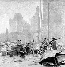 Having returned to San Francisco, he began to enjoy the pleasures of the infamous Barbary Coast red light district, while on leave from his post at Monterey. This was not to last as within a month of arriving in California, a massive 7.9 magnitude tremendous earthquake and subsequent fires virtually destroyed San Francisco on April 18, 1906. Holmdahl was eventually able to get to his duty station at Monterey, where he was immediately sent back to the front lines of the moldering remains of the city to rescue residents and maintain order, mainly from looters. "It was worse than soldiering in the Philippine Islands. I was on guard at the United States Sub Treasury Building for 125 hours with little sleep," Holmdahl commented on his service in San Francisco.[17]