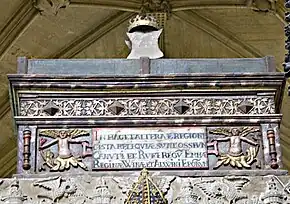 After her death in 1052, Emma was interred alongside Cnut and Harthacnut in the Old Minster, Winchester, before being transferred to the new cathedral built after the Norman Conquest.[16] During the English Civil War (1642–1651), their remains were disinterred and scattered about the Cathedral floor by parliamentary forces. The jumbled bones were later re-interred.