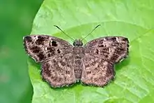 Eretis melania, also known as the dusky elf, dusky skipper or common elf, is a species of butterfly in the family Hesperiidae. It is found in Guinea, Sierra Leone, Liberia, Ivory Coast, Ghana, Togo, Nigeria, Cameroon, Gabon, Angola, the Democratic Republic of the Congo, southern Sudan, Uganda, Kenya, Tanzania, Malawi, northern Zambia, Mozambique, eastern Zimbabwe and northern Namibia.[2] The habitat consists of woodland, Guinea savanna, forest margins and forests.
