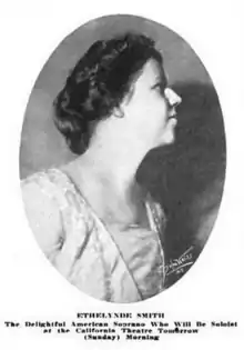 Ethelynde Smith was born in Portland, Maine, the daughter of Mr. and Mrs. George E. Smith.[1] She trained as a singer in Boston and New York.[2] After some local success, she was invited to be a soloist at the Maine Music Festival in 1916, singing alongside Geraldine Farrar.[3][4]
