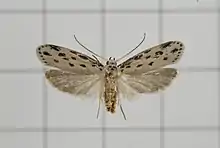 The wingspan is 24–35 mm (0.94–1.38 in). The forewings are whitish-grey, with black spots. The hindwings are darker brownish-grey, but lighter on the fringe of the apex.[1]