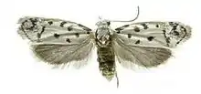 The length of the forewings is 6.3–6.8 mm (0.25–0.27 in) for males and 6.5–7.5 mm (0.26–0.30 in) for females. The ground color of the forewings is white with six defined dots distributed on two-thirds from the base. There is a line at the terminal area from almost the center of the wing to the tornum. The hindwing ground color is dark brown.