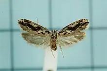 The wingspan is 14–16 mm (0.55–0.63 in). The forewings are overlaid with black markings on a whitish grey background. The hindwings are whitish grey.[2]
