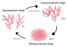 A. armata goes through haploid and gametophytic phases in a heteromorphic diplo-haplontic life cycle.[3] The A. armata gametophyte grows into adult form and goes through fecundation to produce diploid carposporophyte; which, then, divide into tetrasporophyte that goes through meiosis to be developed into the gametophyte.[8]