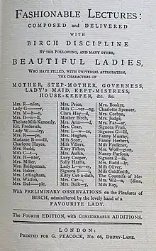 Fashionable Lectures: Composed and Delivered with Birch Discipline was a pornographic book originally published in the 18th century and republished by John Camden Hotten as volume 7 of his series The Library Illustrative of Social Progress around 1872 (falsely dated 1777).[1][2] Hotten claimed to have found them in the library of Henry Thomas Buckle (1821–1862) but Henry Spencer Ashbee claimed that they were in fact from his collection.[3][4] The first edition was published around 1750[5] and again with illustrations by William Holland in the 1780s.[6]