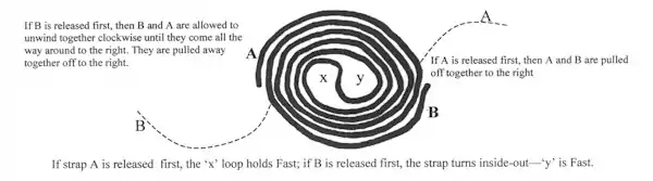Two or more loops are formed within the circle of a string (see figure below). The spectator bets on which loop will hold Fast. In this version, it doesn’t matter in what manner the string is picked up. Instead, the important thing is the method used to lay it out. Laid out in one pattern, one of the loops holds "fast." Laid out in what looked like an identical pattern, none of the loops would hold "fast" — the victims cannot win. Since both the belt style games and the endless string and loop games are so similar, Fast and Loose is often used as a general term for this kind of game.