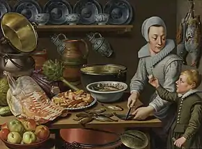 Floris van Schooten painted in various still life genres including breakfast pieces, fruit pieces, market scenes and large kitchen pieces.[2] He was not an innovator himself but reflected in his works promptly the innovations that occurred in the local still life scene. His oeuvre thus bears testimony to the historic development of still life painting in the Netherlands.[3] His works show the influence of his contemporaries in the Haarlem guild, Floris van Dyck, Pieter Claesz., and Roelof Koets.[1] His work also shows familiarity with the work of the painters Pieter Aertsen and Joachim Beuckelaer, who in the preceding century had created in Antwerp large-scale market scenes incorporating still lifes. Floris van Schooten simplified the format of these predecessors thus creating a greater sense of order and stability.[2]