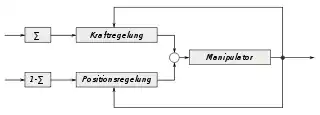In hybrid force control, force control is used for the restricted space, and position control is used for the unrestricted space. The figure shows such a control. The matrix Σ indicates which space directions are restricted and is a diagonal matrix consisting of zeros and ones.