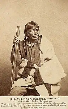 Despite an undercurrent of mistrust, relations between settlers and Chippewa was mainly peaceful in northern Minnesota. That nearly changed when the Santee Sioux hostilities broke out. According to the media Chief Hole in the Day of the Gull Lake Band considered the Sioux conflict as an opportunity to gain leverage for redress of grievances by threatened to launch a simultaneous war in northern Minnesota. The rumors caused fearful settlers to flock to Fort Ripley for security.[2] Not all of Hole-In-the Day's Gull Lake band were in agreement with him. Chief Qui-We-Sain-Shish (Bad Boy) went to Fort Ripley on his own.[22] Company's from both the 6th and 7th Minnesota were rushed to the post. Word reached the Mille Lacs Band reservation that Chief Hole-in-the-Day was considering attacking the fort. Head civil Chief Shaw-Bosh-Kung of the Mille Lacs Band of Ojibwe organized his band and lead 700-750 warriors to Fort Ripley to defend the fort and to volunteer to fight the Sioux.[23] According to the record they presented a sight waving flags and beating drums.[23] Later the 27th Iowa recorded that the Mille Lacs had a U.S. flag and one that they had made with and eagle and stars.[24] The Indian commissioner Dole met with them and told them to return to the reservation and they would be contacted if their assistance was needed.[23] Dole also gave the Mille Lacs a document in appreciation of the Mille Lacs offer stating that they could stay on their reservation for a 1000 years.[23] War Chief Mou-zoo-mau-nee and 300 warriors remained at Ripley to augment in its defense, 200 from the Mille Lacs band along with 100 from the Sandy Lake and Snake River and Chippewa River Bands. According to Chief Mou-zoo-mau-nee's obituary the people of Little Falls asked for protection. The town was 15 miles downriver from the fort. He sent 150 warriors.[25] The town's woman prepared a welcome meal and the men smoked the peace pipe with the warriors. Shortly after the executions in Makato the Chippewa leaders were summoned to Washington where Lincoln repeated that the Milles Lacs could remain on their reservation for a 1000 years.[23]: 116 It was also written into the treaty they signed in Article 12. The Chippewa signed another treaty in 1864 where it is reiterated with the addition that the Sandy Lake band could not be moved without Presidential approval. The State erected a large monument to the Chief and the Mille Lacs band at Fort Ridgely in 1914.[26] In recognition for their service to the State the participating bands were designated as "non-removable". On September 2 two Chiefs of the Fond du Lac band were the first to send Lincoln an offer to fight the Sioux.