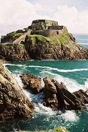 The Fort de Bertheaume is a fort in Plougonvelin, in the Department of Finistère, France. It is located on a tidal island that nowadays connects to the mainland via a footbridge. The fort sits well above sea level, and its steep cliffs have rendered it easily defended for centuries. Since the 17th century, the fort's role has been to monitor the Goulet de Brest, the straits of Brest.