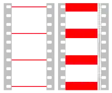 Frame lines shown in red on a "full-frame" negative, and on a "hard-matted" 1.85:1 projection print, both on 35 mm film.