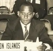 Aqorau then studied at the University of Canterbury and in 1956 became the first Solomon Islander to graduate with a bachelor's degree.[2] He remained at the university until the following year to earn a master's degree.[1][3][4] He married Merle Aqorau in 1958, later adopting her surname.[5] The two relocated to England, where he spent a year at the University of Cambridge studying colonial administration,[5] also visiting local councils, while his wife studied domestic science in London.[4] After returning to the Solomon Islands, he became a Cadet Administrative Officer in Malaita in 1959. He was soon promoted to Deputy Commissioner, the first Solomon Islander to reach such a position. In June 1962 he was also the first Solomon Islander to be appointed as a magistrate.[1]