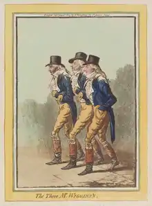 ![]() Viscount Mathew and his brothers by Gillray, 1803: The Three Mr Wiggins's. The title is a reference to that year's play Mrs Wiggins by John Till Allingham. | |