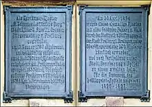 - Left: Founded as Carthusian monastery "St. John the Baptist's Mountain" in 1346 by Knight J. Snewlin Gresserm, mayor of Freiburg, burned down on 13 January 1780, and rebuilt provisionally, dissolved on 14 May 1782 by emperor Joseph II, acquired by Anton Baron of Baden, 1830 passed by inheritance to Bruno Baron of Türkheim and 1879 by purchase to the private citizen h W. Lüps. Right: On 30 April 1894 this former monastery with all buildings, fields and forest was purchased by the city council and foundation board of Freiburg city under Mayor Dr. O. Winterer and, after distribution to city, construction company and hospital, rebuilt to a second home for the occupants of the Holy-Spirit hospital 1895-1897.