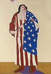 Scholder has always worked in series of paintings. In 1967, his new series on the Native American, depicting the "real Indian," became an immediate controversy. Scholder painted Indians with American flags, beer cans, and cats. His target was the loaded national cliché and guilt of the dominant culture. His portraits have been described as drawing out "the psychic cost of the gap between romantic and backward-looking popular stereotypes of Indians and the actualities of their daily lives" and as often employing "a sardonic humour in their revelations of the absurdities of Native people's lives in the twentieth-century world".[8] Scholder did not grow up as an Indian and his unique perspective could not be denied. Scholder resigned from IAIA in 1969 and traveled to Europe and North Africa. He returned to Santa Fe and acquired a small adobe house and studio on Canyon Road.
