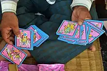 Ganjapa is played as "Charirangi" (cards of 4 colors or 4 suits in a pack of card), "Atharangi" (cards of 8 colors),[1] "Dasarangi" (cards of 10 colors), "Bararangi" (cards of 12 colors), "Caudarangi" (cards of 14 colors) and "Sohalarangi" (cards of 16 colors). Each color has 12 cards that makes the total number of cards an integer of number associated with the card's name, i.e. a "Charirangi Ganjapa" has 48 cards similar to playing cards, "Atharangi Ganjapa has 96 cards and so on.[2][5] Each color is recognizable by a unique background color. Each suit contains 10 numbered cards (1-10), a king and vizier. The king possesses the highest value followed by the vizier and then the numerical series in descending order. The king's card has a painting of him in sitting posture with legs folded at the knees (known as "chauka madi basa"), with the vizier's card with him standing. The king is also seen riding a chariot with the minister mounted on a horse. Some of the cards have the king with two heads and the minister with one head. Signature figures from Pattachitra like imaginary figure with human head and four legs of four different animals are also seen in cards.[9]