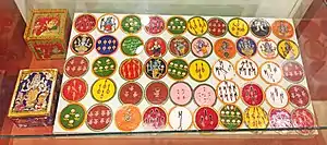 Ganjapa (Odia: ଗଞ୍ଜପା) are the traditional playing cards from the Indian state Odisha.[1] It can also refer to the trick-taking card game that they are used for. It is played with circular shaped Pattachitra painted cards. Originated in the 16th century, Ganjaku is a recreational game for male members of the Odia society, primarily villagers, kings and their courtmen. Ganjapa is played as "Charirangi" (cards of 4 colors), "Atharangi" (cards of 8 colors), "Dasarangi" (cards of 10 colors), "Bararangi" (cards of 12 colors), "Chaudarangi" (cards of 14 colors) and "Sohalarangi" (cards of 16 colors). The variation of this game influenced by Persian card game Ganjifeh is known as "Mughal Ganjifa". The game is popular in Puri and Ganjam district of Odisha.[2][3] As a result of the relative isolation of Odisha in the past, Ganjapa developed very differently from the Ganjifa found in the rest of India.[4] Odisha has by far the largest community of Ganjifa players and manufacturers.