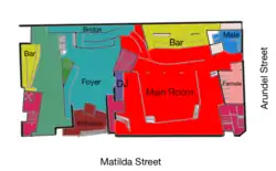 The focal point of the club was the main room. This was roughly a square double height room with a balcony on two sides. The front and rear of the room were small stages, with the DJ booth originally positioned on the front stage. Over the years a dedicated raised booth was constructed. Railings were positioned around the dance floor area and on the stage. The front stage railings were later removed and replaced with steps.