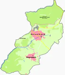 The municipal area comprises 535 ha in the constituent community of Geiselbach and 415 ha in the constituent community of Omersbach.