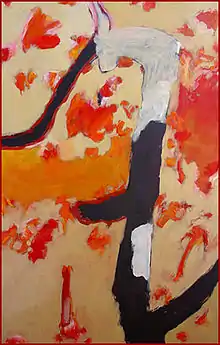 In 1990, Magalios painted the first, of what would continue to be his most important series of Autumn-themed paintings. The work was a red-orange series of "leaves" on multiple 2x4 studs of wood that were individually screwed into a wall to become both a sculptural and painterly work.