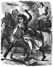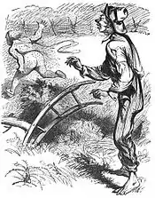 Revenge pranks are a common theme in the Sut Lovingood tales. In "Parson John Bullen's Lizards," for instance, Parson Bullen, a fire-and-brimstone preacher, beats Sut with a club after catching him in the bushes with a girl at a camp meeting. Later, when Bullen is preaching to a large crowd, Sut releases several lizards, which crawl up Bullen's legs, prompting him to strip off his clothes in terror.[13] Another target of Sut's revenge is Sicily Burns, a mountain woman who tricks Sut into drinking baking soda. In response, Sut causes a bull to wreak havoc at Sicily's wedding.[14]