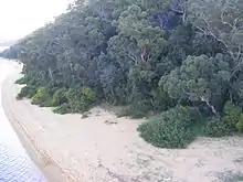 - Flora – The river side predominantly consist of mangrove swamps, occupying 24 hectares on the national park, and salt marshes occupying 11 hectares of the national park. However, aerial photo analysis suggest between 1966 and 1998 unauthorised vehicles, BMX bikes, and motorised dirt bikes have reduced and declined these occupied areas of mangrove swamps and salt marches.[9] The most common vegetation found throughout the park is Sydney Hinterland Exposed Sandstone Woodland, covering 293 hectares,[10] characterised by eucalyptus trees 10–25 metres tall and small sclerophyll shrub. However, other floral habitats can be found in the national park as well, such as, Littoral Rainforests, Sydney Coastal Heaths, Coastal Freshwater Lagoons, and Coastal Floodplain Wetlands. Prioritised tree species that are under threat identified in the park are swamp mahogany and red gum. These are flowering tree species which nurture and feed animals species such as the grey-headed flying fox and little lorikeets. They are under-threat due to high public disturbance, and are not widely dispersed within the park. Moreover, there has been a reduction in the numbers of hollow-bearing trees with in the park, which shelter and allow for the breeding of Sittella bird species.[1]