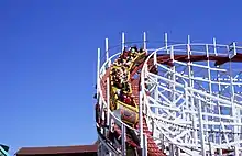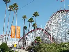 In 1974, the ride received a new coat of paint with Victorian-style architecture around the station.[5] In the 1989 Loma Prieta earthquake, the Giant Dipper was practically untouched. The ride was closed for about a month to be inspected. The park held a benefit for victims of the earthquake.[6][7] In 2002, the ride celebrated its 50 millionth rider.[8] Ten years after the 50 millionth rider, the park celebrated the Giant Dipper's 60 millionth rider on July 27, 2012. The park gave out trivia coasters leading up to the event. The 24 riders that were on the train when it hit 60 million riders received a hoodie among other prizes.[9]