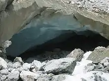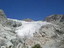 As with almost all alpine glaciers, the foot of the Glacier Blanc has retreated. In earlier times, most recently in 1866,[8] it formed a single glacial system with its southern neighbour, the moraine-covered Glacier Noir, whose streams joined one another above the Pré de Madame Carle.[9] During the Little Ice Age, the combined ice system reached its maximum extent in 1815 and ended roughly at the height of the Cezanne Hut (1,874 m).[2][10]