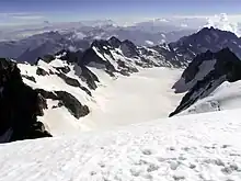 With its 5.9 km-long tongue (in 2002), the Glacier Blanc is the longest glacier in the Massif des Écrins and the largest in the southern French Alps.[3] Its area of 5.34 km2 (2002)[4] is not, however, as great as that of the Glacier de la Girose and the Glacier du Mont-de-Lans, which form a common system.[2] The Glacier Blanc is a typical valley glacier, which initially runs in a curve towards the northeast below the Barre, before its tongue turns southeast, becoming an icefall. Its average incline is about 30%,[4] but it is flatter in its central section than on the north slope of the Barre des Écrins or in the icefall of its lower section.