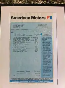 In contrast with high-performance versions – such as the 1969 Hurst SC/Rambler, 1970 Rebel Machine, and 1971 Hornet SC/360 – that had their own model number, only an original window sticker (Monroney sticker, factory order form, or a build sheet can authenticate whether a particular vehicle was originally factory equipped with a Go Pack because there is no identification code within the vehicle identification number (VIN) or on AMC's metal door tags to identify this option.[7]