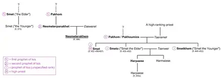 - The name of the creator of the graffito was translated as Nesmeterakhem by Richard B. Parkinson in 1999, whose translation of the inscriptions themselves are used in this article.[1] Another often used translation of the name is Esmet-Akhom[2][3] or Smet-Akhom.[4]