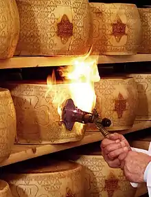 Like parmesan, Grana Padano is a semi-fat hard cheese which is cooked and ripened slowly for at least nine months. If it passes quality tests, it is fire-branded with the Grana Padano trademark. The cows are milked twice a day.[7] Milk produced in the evening is skimmed to remove the surface layer of cream and mixed with fresh milk produced in the morning. The partly skimmed milk is transferred into copper kettles and coagulated; the resulting curd is cut to produce granules with the size of rice grains, which gives the cheese its characteristic texture, and then warmed to 53–56 °C (127–133 °F). It is produced year-round, and varies seasonally as well as by year. Though similar to parmesan cheese, the younger Grana Padano cheeses are less crumbly, milder and less complex in flavor than the better-known, longer-aged parmesan.[1]